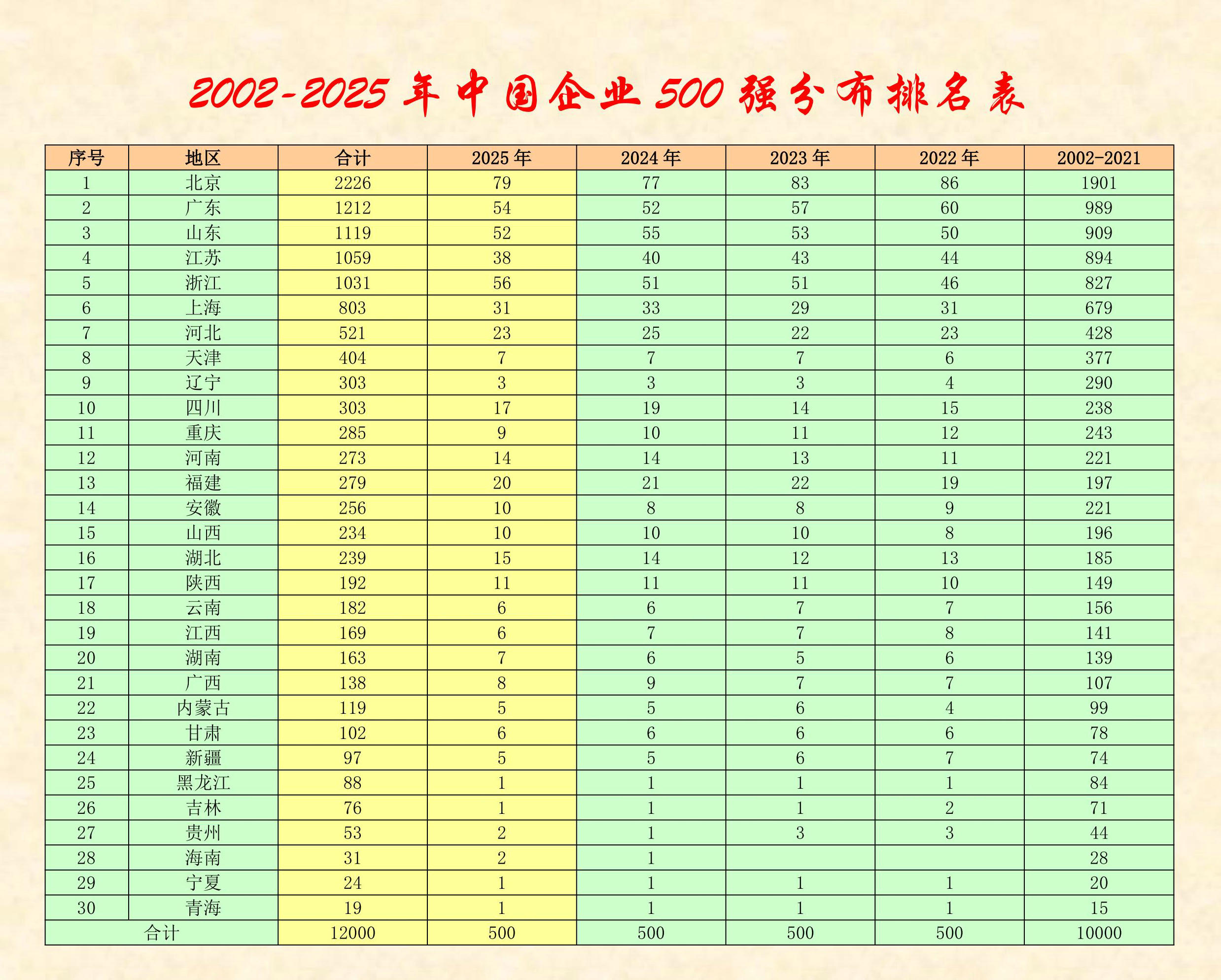 2025中国企业500强共分布在30个省(自治区、直辖市)中,分布最多的五个地区依次是北京、浙江、广东、山东和江苏。
