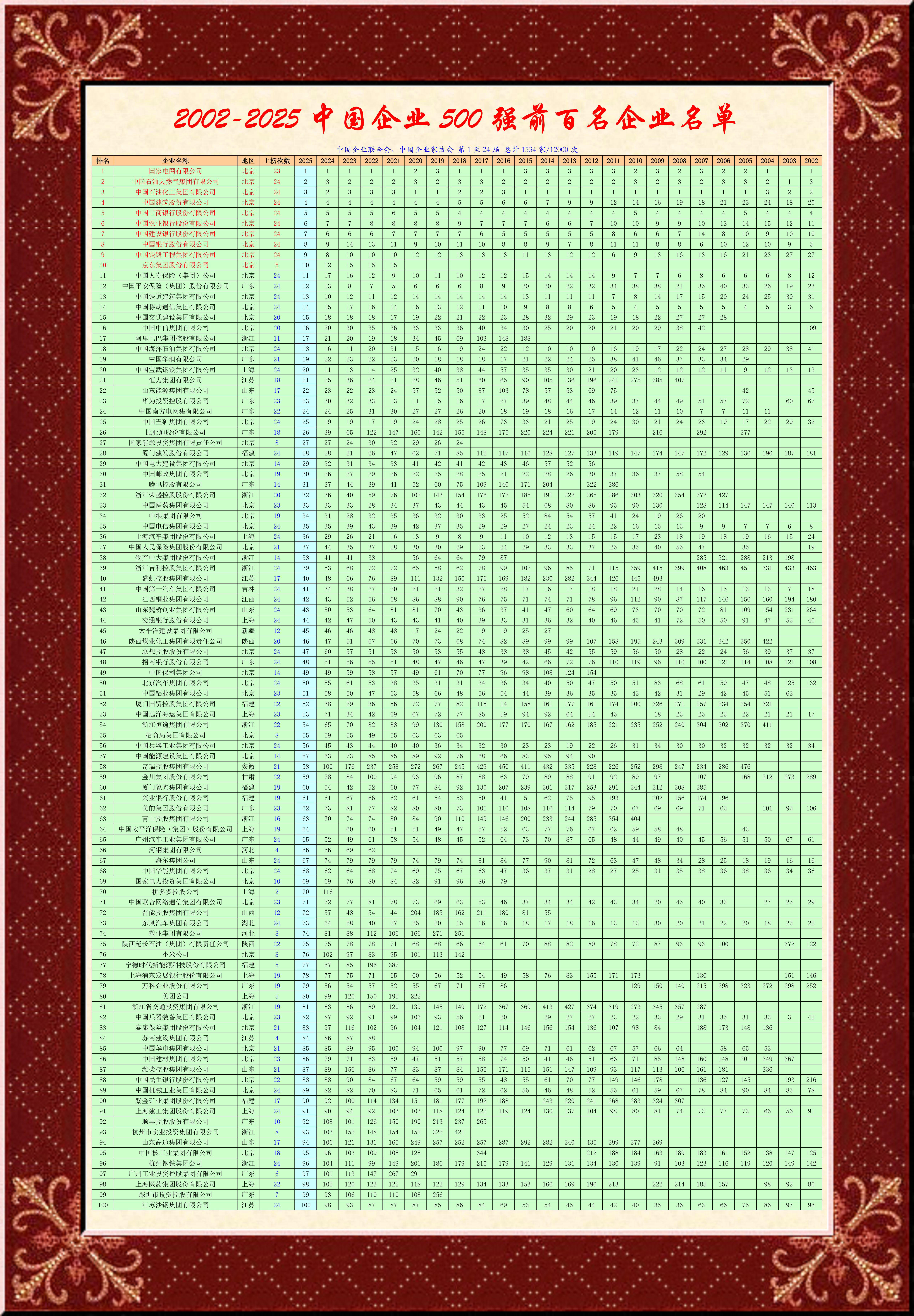 【学习园地】2025中国企业500强前百名上榜次数明细表