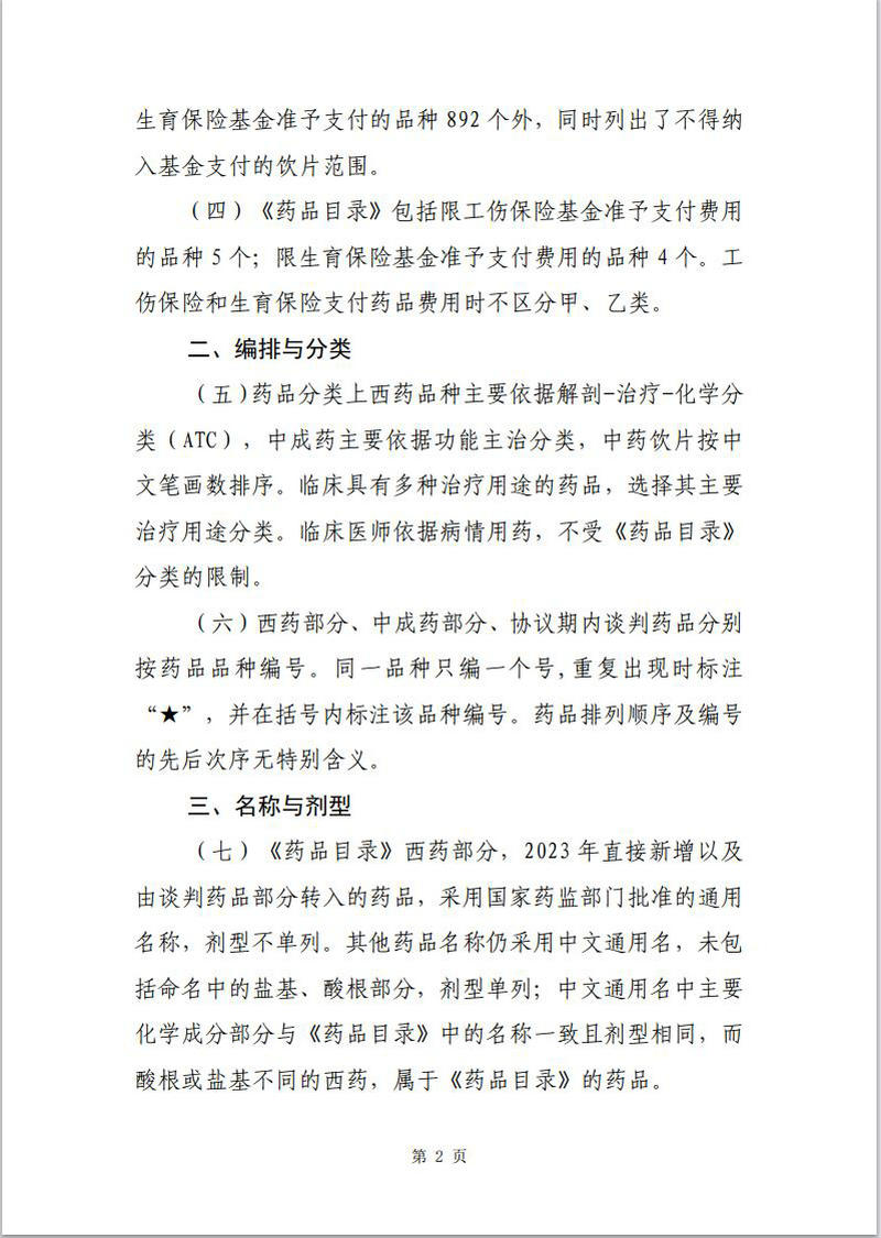 (七)《药品目录》西药部分,2023年直接新增以及由谈判药品部分转入的药品,采用国家药监部门批准的通用名称,剂型不单列。其他药品名称仍采用中文通用名,未包括命名中的盐基、酸根部分,剂型单列;中文通用名中主要化学成分部分与《药品目录》中的名称一致且剂型相同,而酸根或盐基不同的西药,属于《药品目录》的药品。