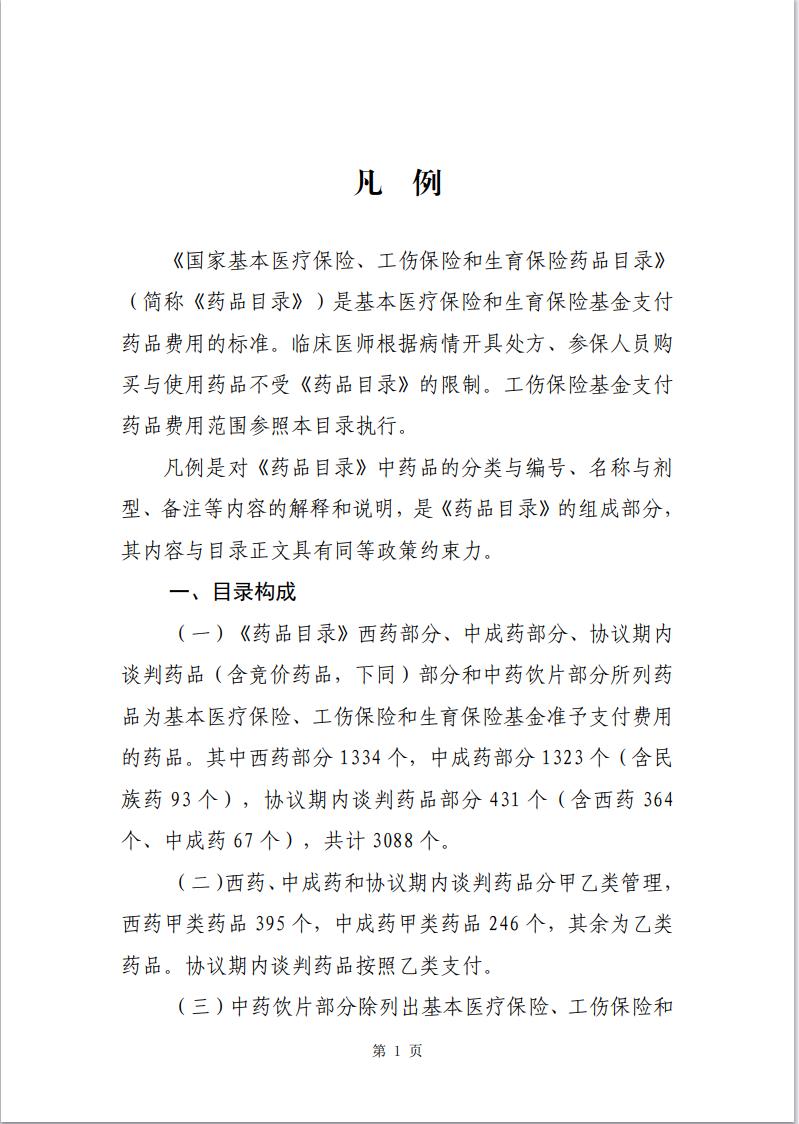 (一)《药品目录》西药部分、中成药部分、协议期内谈判药品(含竞价药品,下同)部分和中药饮片部分所列药品为基本医疗保险、工伤保险和生育保险基金准予支付费用的药品。其中西药部分1334个,中成药部分1323个(含民族药93个),协议期内谈判药品部分431个(含西药364个、中成药67个),共计3088个。