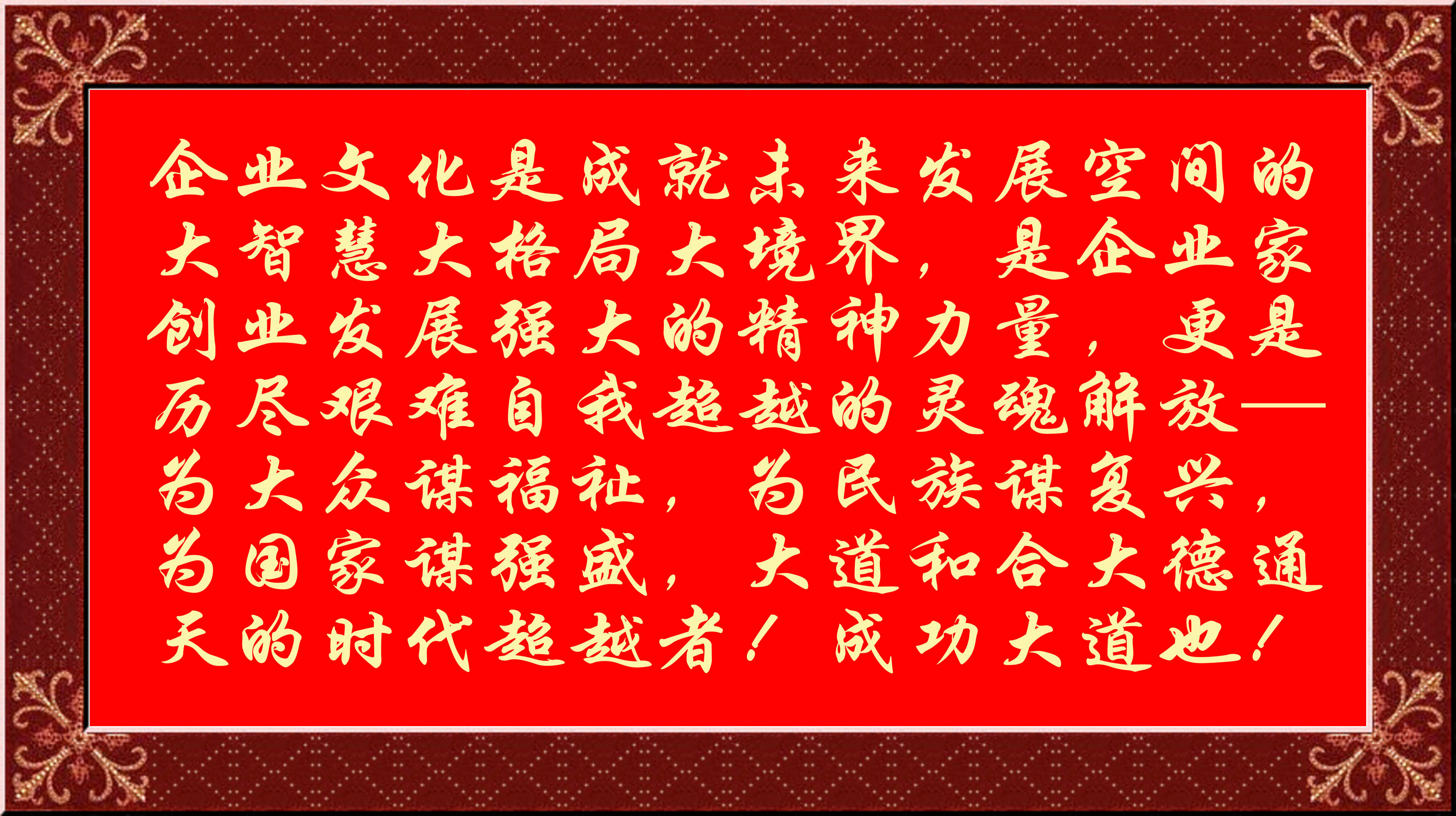企业文化是成就未来发展空间的大智慧大格局大境界,是企业家创业发展强大的精神力量,更是历尽艰难自我超越的灵魂解放——为大众谋福祉,为民族谋复兴,为国家谋强盛,大道和合大德通天的时代超越者!成功大道也!