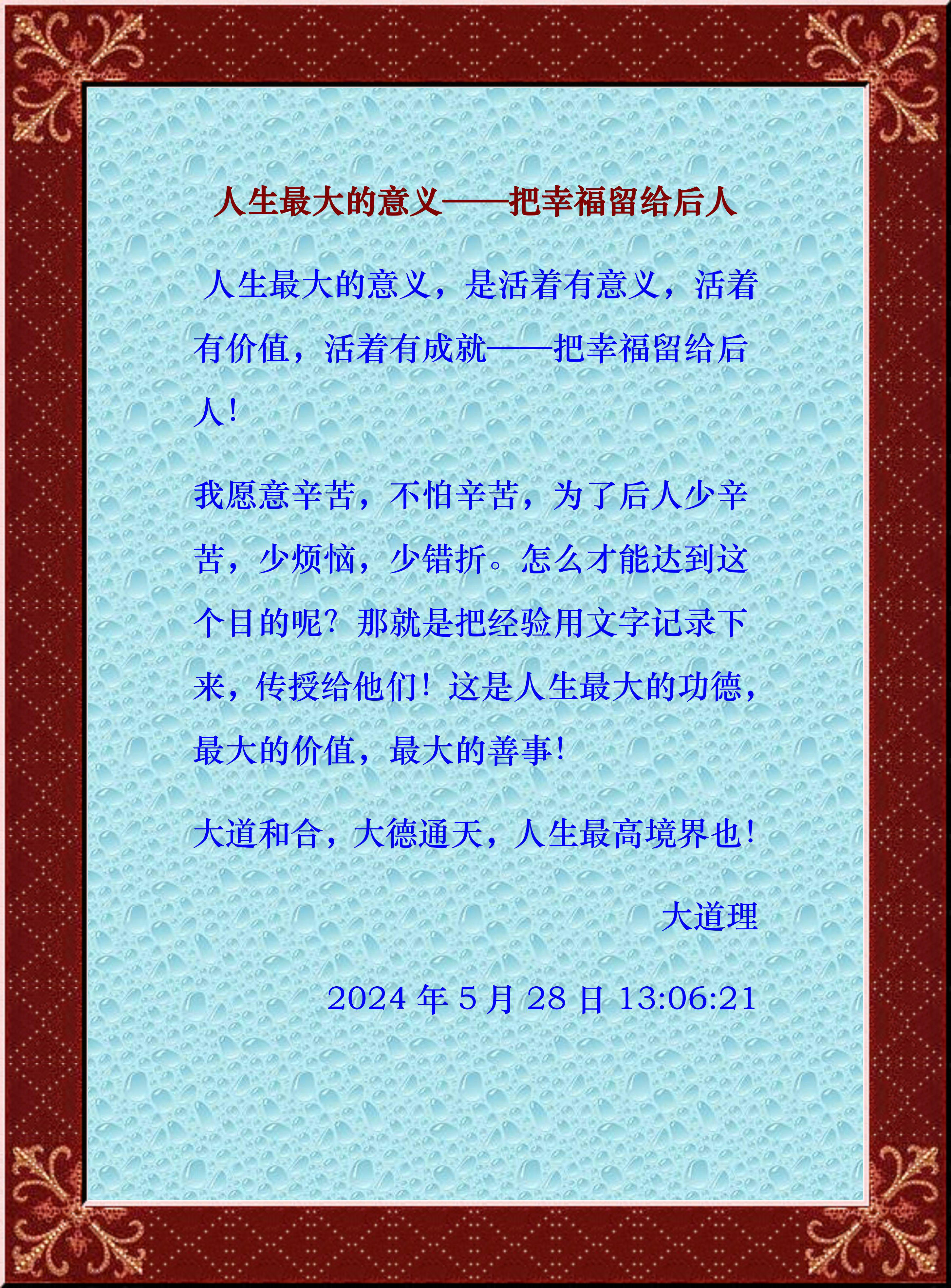 人生最大的意义,是活着有意义,活着有价值,活着有成就——把幸福留给后人!