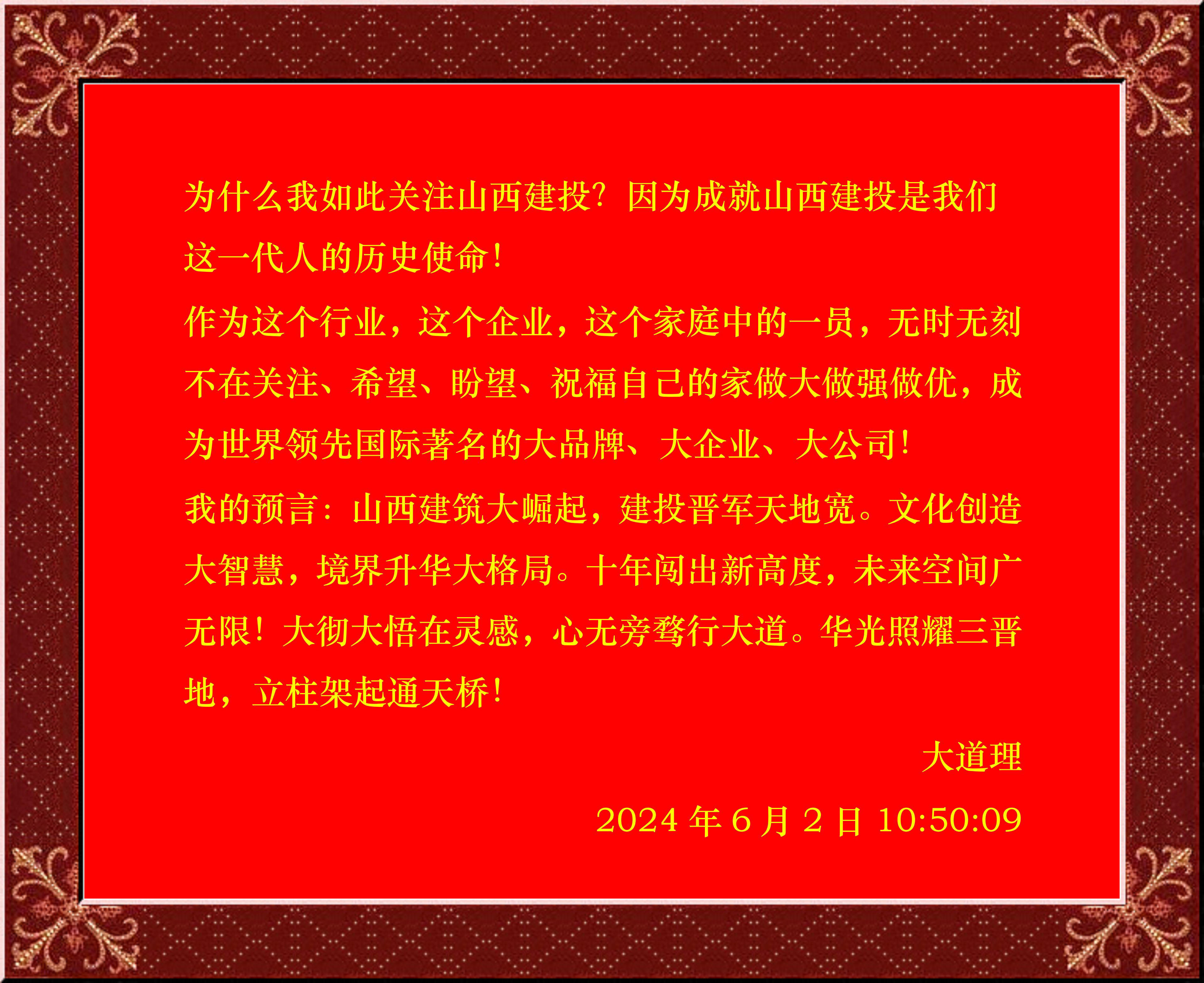 我的预言:山西建筑大崛起,建投晋军天地宽。文化创造大智慧,境界升华大格局。十年闯出新高度,未来空间广无限!大彻大悟在灵感,心无旁骛行大道。华光照耀三晋地,立柱架起通天桥!