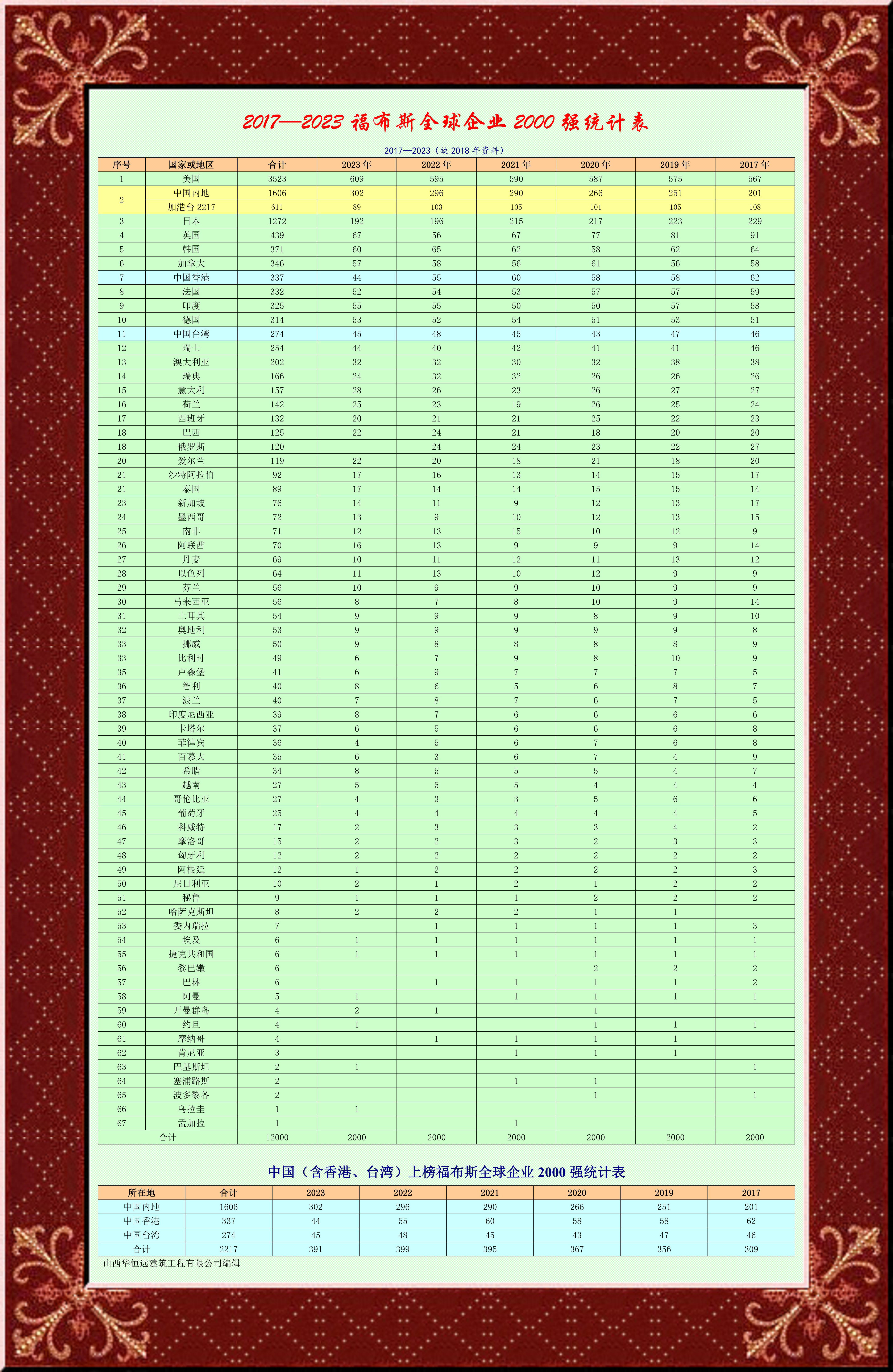 在《福布斯》发布的第22届全球2000家最大上市公司年度排行榜上,有621家美国公司上榜,高于去年的611家,这也是该国自2007年金融危机以来上榜企业最多的一次。今年上榜的中国(包括港澳台地区)企业数量为366家,与2022年399家的历史最高记录相比有所下跌,但企业数量仍保持在全球第二的位置,并无压力。